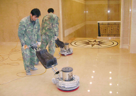 3、整平研磨拋光--鑒于石面以前做過防水,造成石材變色,我們并沒有直接采用整平研磨的方法,而是先用鋼絲棉,配格蘭高G681 晶面翻新機進行研磨擦打、磨去了石材表面的變色層,顯露出大花白的原有底色。很幸運,由于防護劑滲入石面的程度很輕,我們僅用上述方案就收到了良好的效 果,使我們擔心的變色問題得到了治理。第二套方案即使用大理石翻新鉆石墊逐級打磨拋光,備而未用。